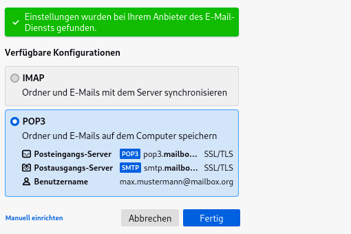 Man kann in der Regel zwischen IMAP und POP3 Accounts wählen. Wenn man auf den Button "Fertig" klickt, wird das Passwort geprüft und der Account erstellt.